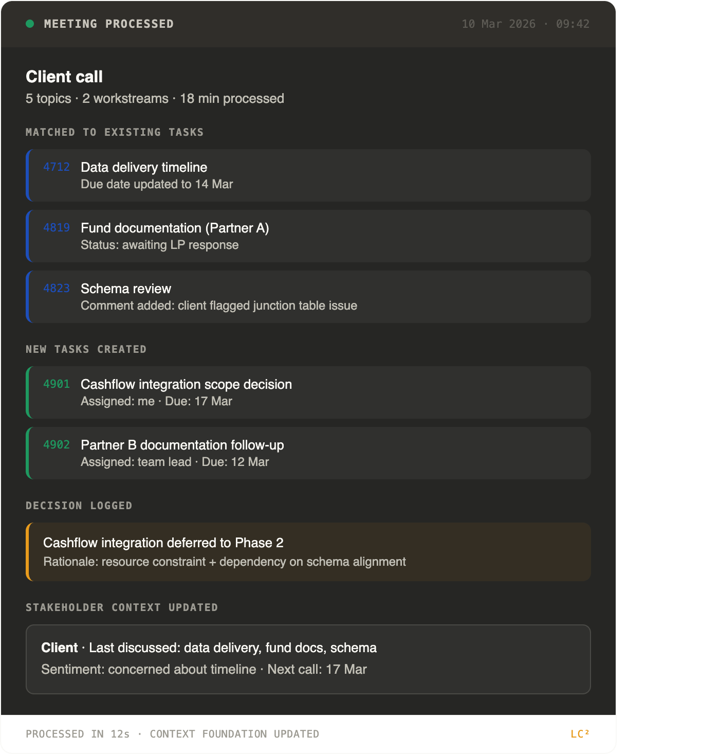 The critical thing is not the time saved. It's that every meeting I process adds to a structured record: stakeholder context, decision history and task linkage that makes the next interaction better.